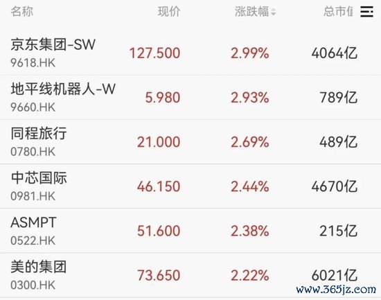 港股三大指数小幅上涨散户股票配资,京东集团、中芯国际、美的集团等涨超2%。