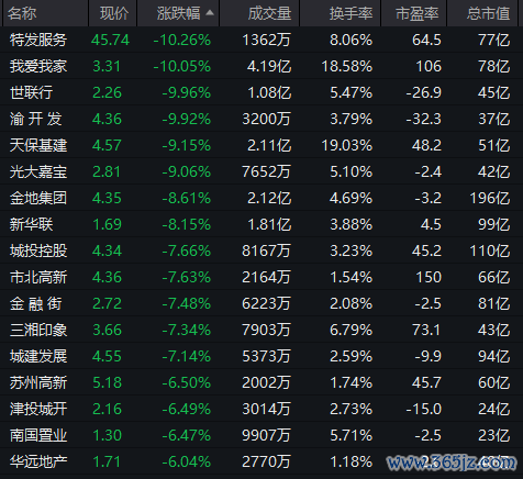 房地产板块大幅走低,我爱我家、世联行、渝开发等多股跌停。