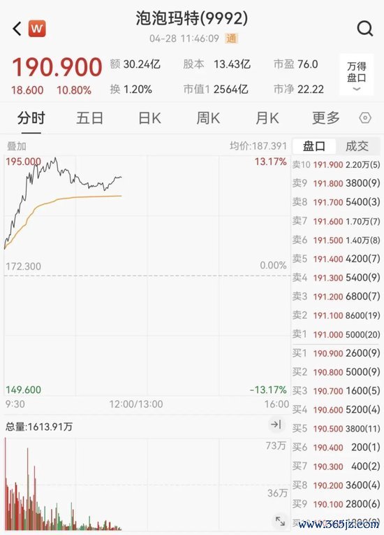 港股泡泡玛特早盘快速拉升,盘中一度涨超13%,股价再创历史新高。截至发稿,该股报190.9港元/股,总市值为2564亿港元。