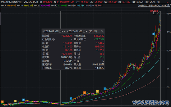 2024年2月1日以来,泡泡玛特股价累计上涨超1000%。